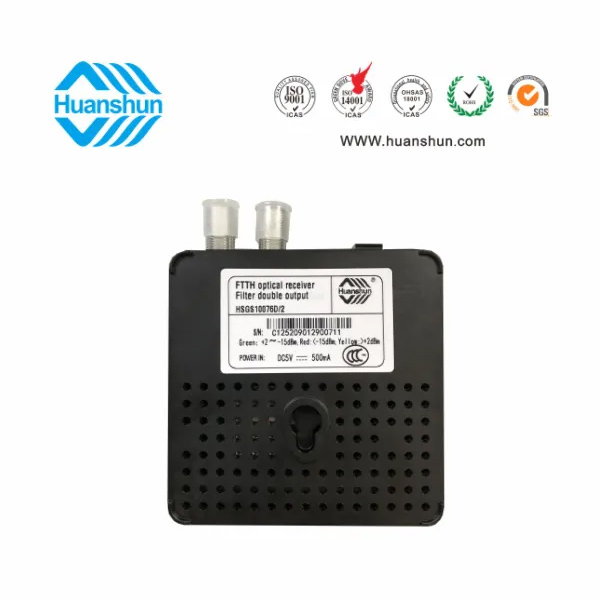 滤波型双输出FTTH光接收机 | HSGS10076D/2 | 1540~1565nm接收,-5~-15dBm/RF 2×72dBuv恒定输出,外接90~255V 5V 0.5A电源适配器 |