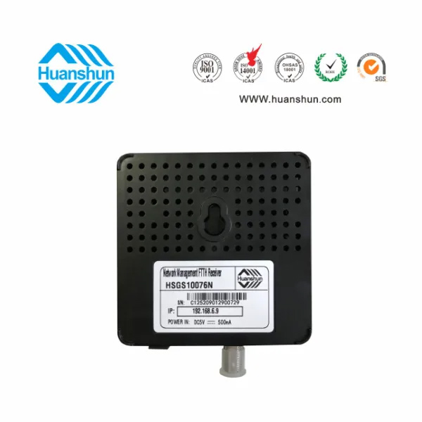 网管型 FTTH光接收机 | HSGS10076N | 1290~1565nm接收,-2~-12dBm/RFMD 82dBuv恒定输出,(RJ45标准网口),外置90~255V 5V 0.5A电源适配器 |