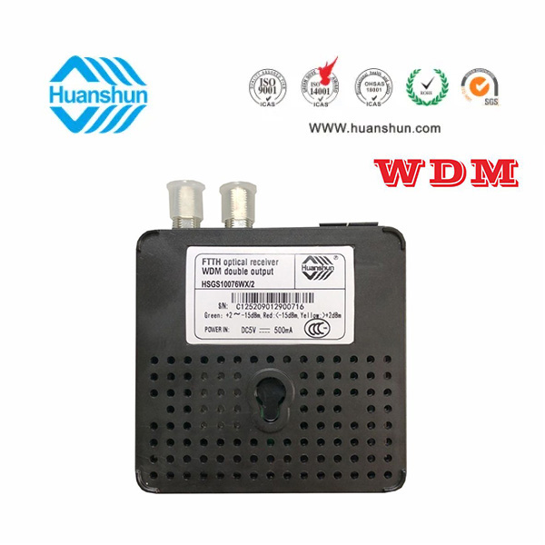 WDM型双输出光接收机 | HSGS10076WX/2 | CATV 1540~1565nm接收,-5~-15dBm/RF 2×72dBuv恒定输出 PON:1270/1310/1490/1577nm;外置90~255V 5V 0.5A电源适配器 |