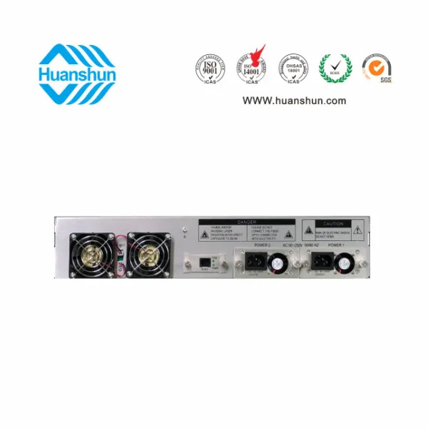 大功率光纤放大器EYDFA | YGF1504-16C | 19 " 2U标准机箱,-5 ~ +10 d Bm输入,4路标称规格(16、17、18、19、20、21、22、23dBm)放大输出,并支持下调-2dB,安全连接模式,NF ≤ 5dB(0dBm时);内置FWDM合波器,插播损耗 ≤ 1dB;双模块热插拨电源,AC90 ~ 255V或DC-48V供电,RJ45标准网管(支持SNMP、WEB) |