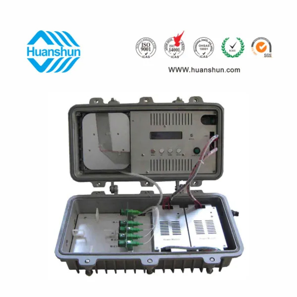野外型防水结构,-5 ~ +10 d Bm输入,4路标称规格(18、19、20、21、22、23、24dBm)放大输出,并支持下调-2dB,安全连接模式,NF ≤ 5dB(0dBm时);双电源AC90 ~ 255V供电或AC35 ~ 75V馈电,RJ45标准网管(支持SNMP、WEB)