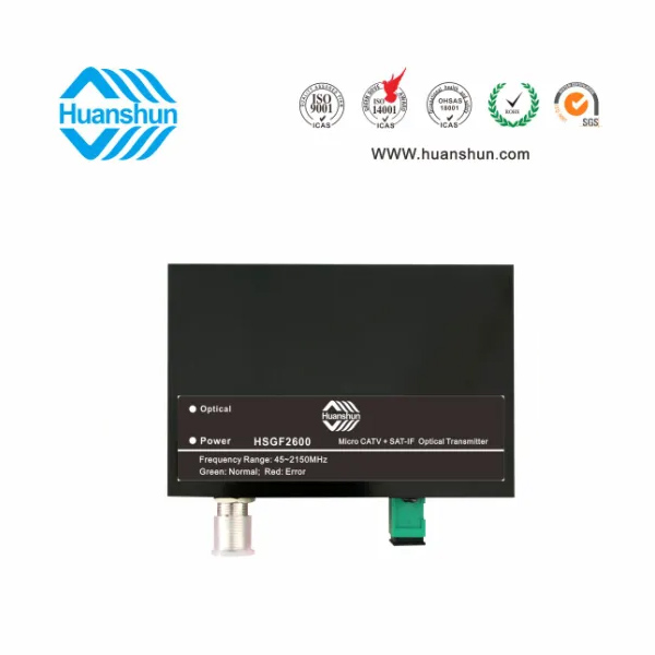 CATV&SAT-IF光发送机 | HSGF2600-1302 | RF工作带宽45~2150MHz,光输出功率有2或3mW可选,型号后缀13代表1310nm波长,15则代表1550nm波长,最后2位数字02表示2mW,03则表示3mW,RF接口F型公制或英制(订货时说明),光输出接口SC/APC |