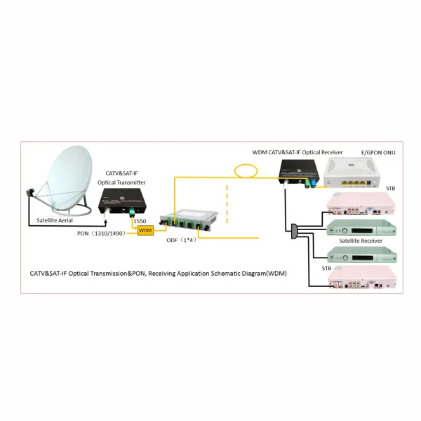 HSGS26082系列CATV&SAT-IF光接收机是一款FTTH型CATV+SAT IF高性能光传输设备,适用于有线电视和卫星直播电视同网传输。本机选用高带宽、高灵敏度光电管和低噪声匹配电路,全鉮化镓IC放大,光接收范围-15~+2dBm,光控AGC-8~0dBm/RF80dBuv恒定输出。为方便用户使用,本机还在面板上设有工作电源和光功率接收监测LED指示灯。HSGS2608W为WDM型CATV&SAT-IF光接收机,它工作于CATV1550nm段和PON段1490/1310nm段,用WDM波分复用技术分离出1540~1565nm波长作CATV光信号接收,把PON段1490/1310nm分离到PON端口,以作PON下联到E/GPON ONU。