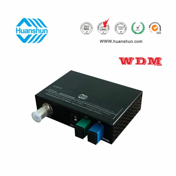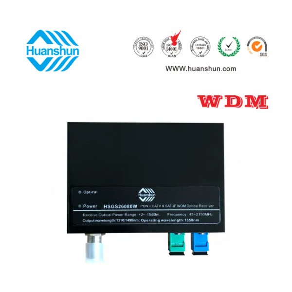 WDM型CATV&SAT-IF光接收机 | HSGS26080W | 光接入1310/1490/1550nm,PON端口1310/1490nm,CATV光工作波长1540~1565nm,光接收功率-8~0dBm/RF CATV80dBuv,RF工作带宽45~2150MHz,SAT-IF65-75dBuv,RF接口F型公制或英制(订货时说明),光输入接口SC/APC |